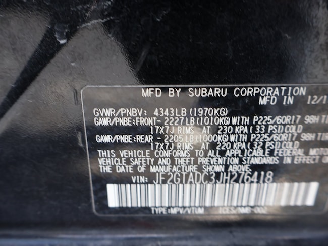 - VIN : JF2GTADC3JH276418